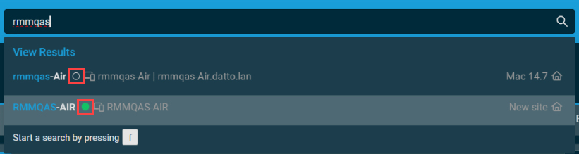 Global search has been updated to display whether a device is online or offline directly in global search results and device group listings. This enhancement makes it easier to identify device availability at a glance. This change takes to the form of a green dot to indicate a device is online, or an empty dot to indicate a device is offline. This enhances our global search with clear, consistent status visibility across the platform.