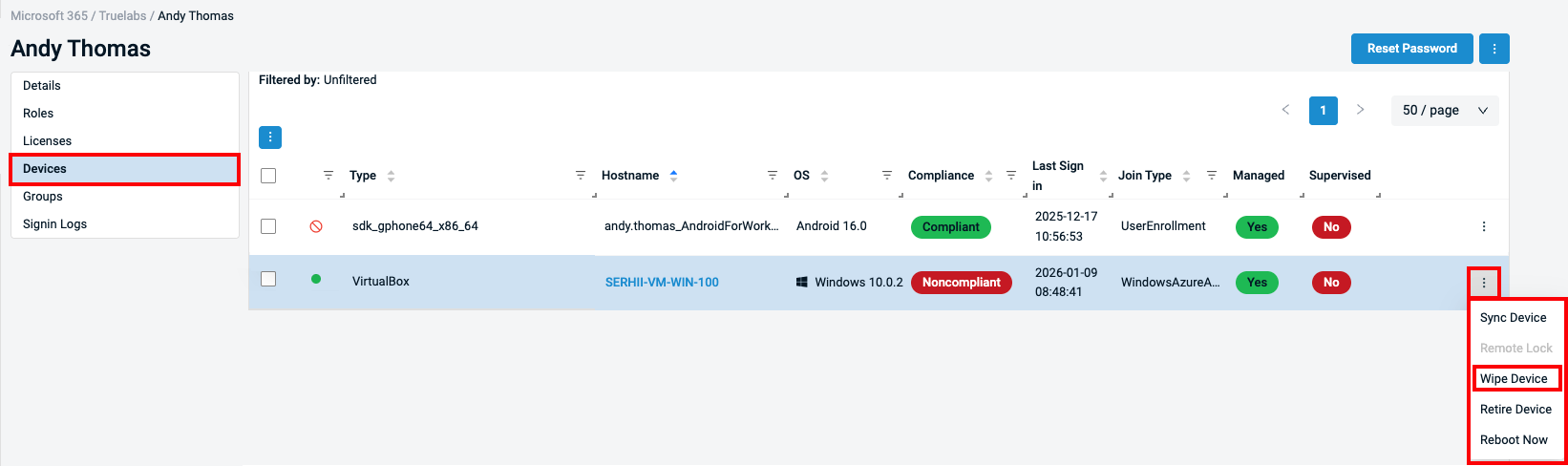 - Keep user data: Removes Intune management and corporate policies while keeping the user’s personal data. The device is unenrolled from Intune and Entra ID, but user files and profiles remain on the device.