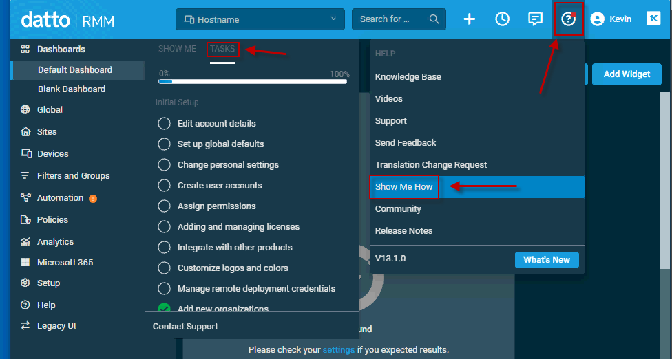 Self-guided onboarding is available for your Kaseya 365 modules when the first administrator logs in. The onboarding will walk you through each part of the application that needs to be configured for your company to start using the product right away.