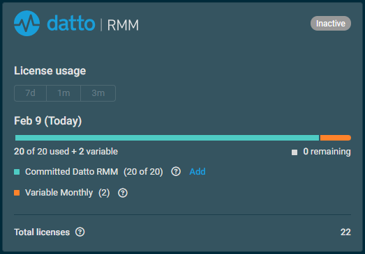 EXAMPLE If your Committed Minimum Quantity of devices is 20, but you have 22 devices deployed, then your Datto RMM license card will look like this:
