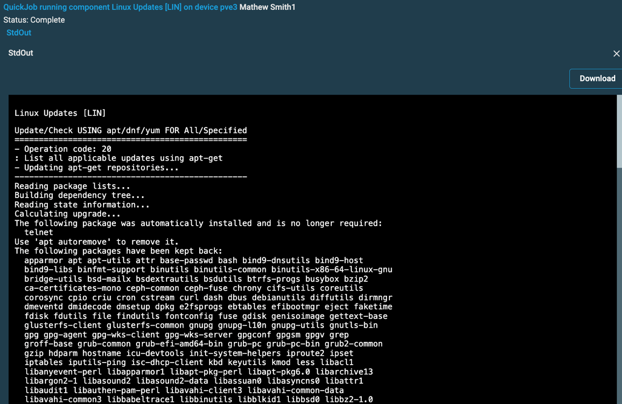 After running the Linux Updates [LIN] component against your Linux OS devices using the Check for Updates option for the usrAction variable, you will want to view the StdOut of the job, which can be viewed per device in the job results via Automation > Jobs > select a job. An example of the job output is shown below.