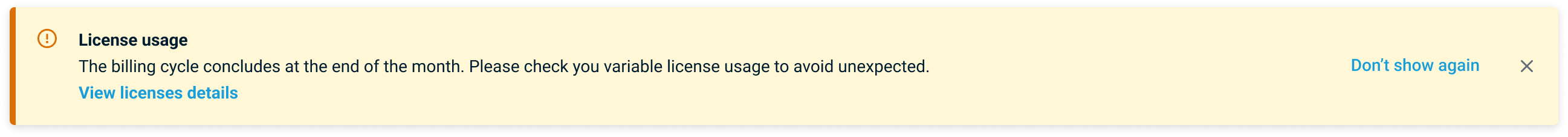 Seven days before each billing cycle ends, admins will see a reminder banner if variable license usage is detected, with a direct link to review license details.